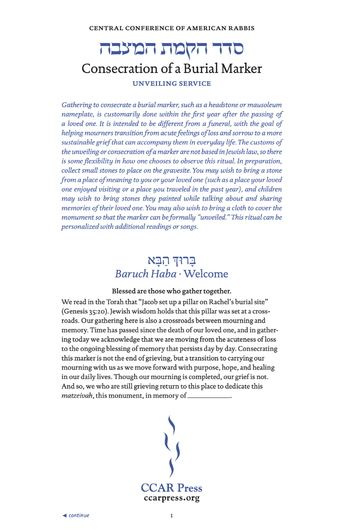 This Z-fold, laminated pamphlet offers prayers, readings, and rituals to comfort the bereaved at an unveiling service to consecrate a burial marker.